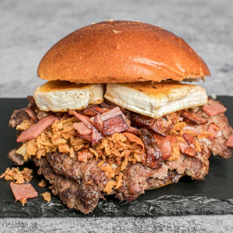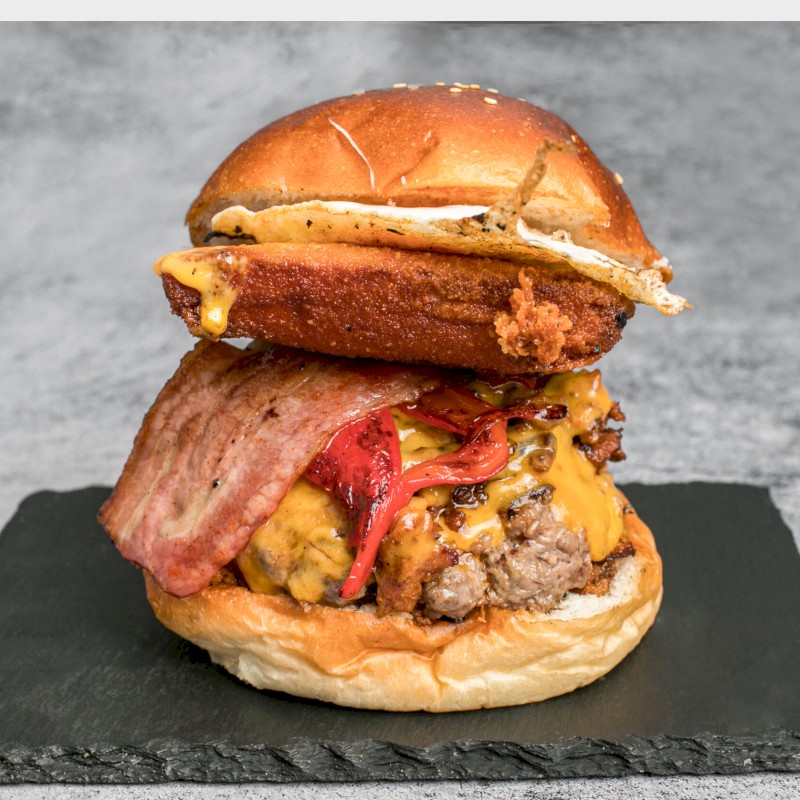 Acompañado de patatas fritas Ingredientes: 2 pisos de 200 gr. de carne, lechuga, cebolla, pepinillo, queso gouda, doble de bacon, mozzarella empanada y huevo |