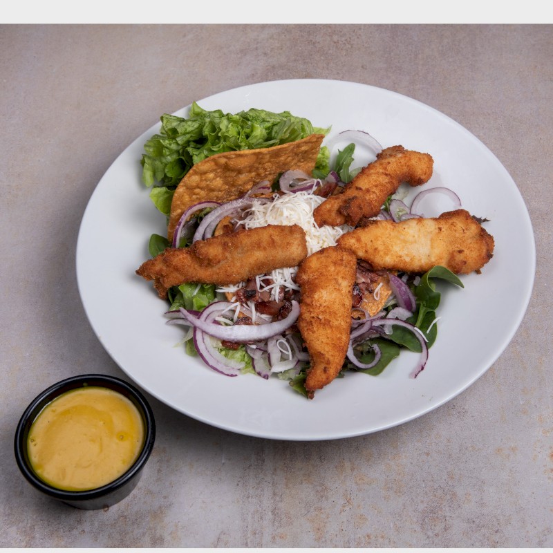 Ingredientes: Mix de lechugas, tiras de pollo empanadas, cebolla morada, tomate cherry, mozzarella rallada, bacon crunchy, nachos crujientes y salsa de mostaza dulce |