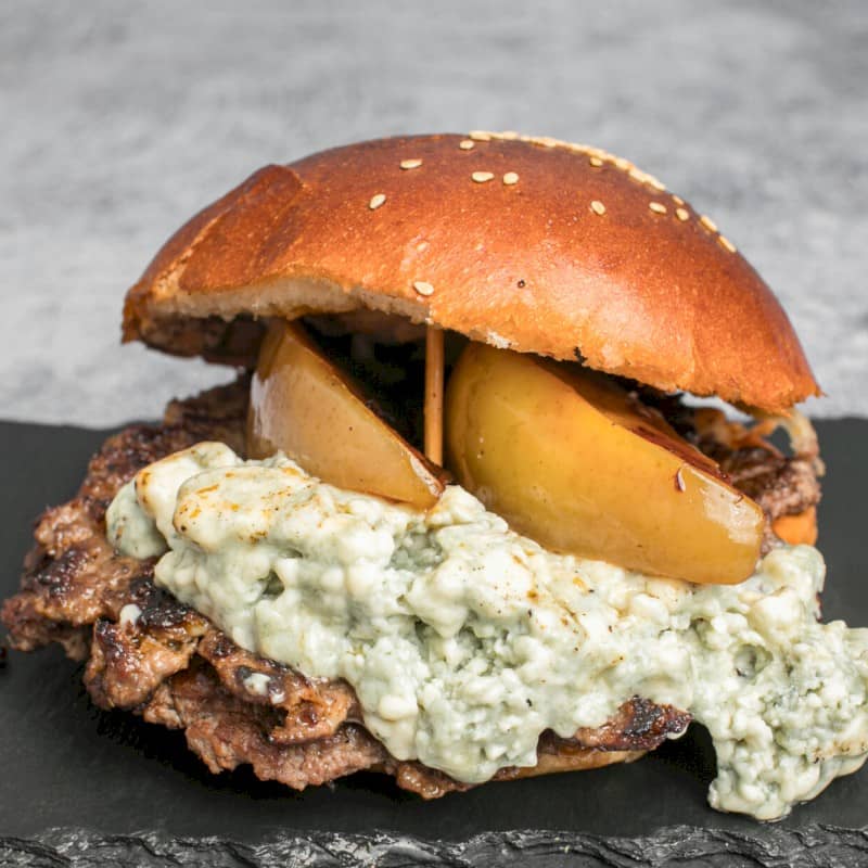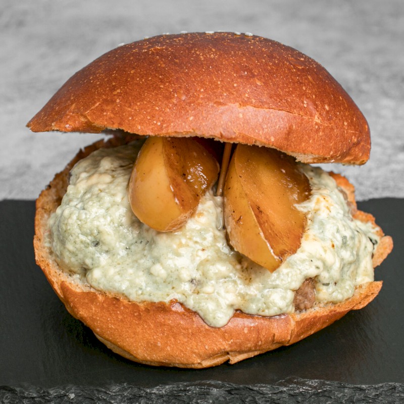 Acompañadas de patatas fritas Ingredientes: 2 pisos de 80 gr de ternera bien smasheada, crema fundida de queso cabrales y manzana confitada |