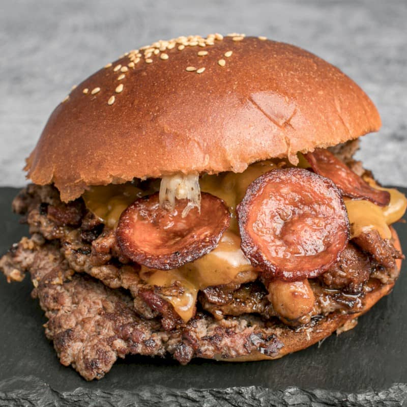 Acompañadas de patatas fritas Ingredientes: 2 pisos de 80 gr de ternera bien smasheada, picadillo de matanza de cerdo ibérico, queso cheddar fundido y rodajas de pepperoni |