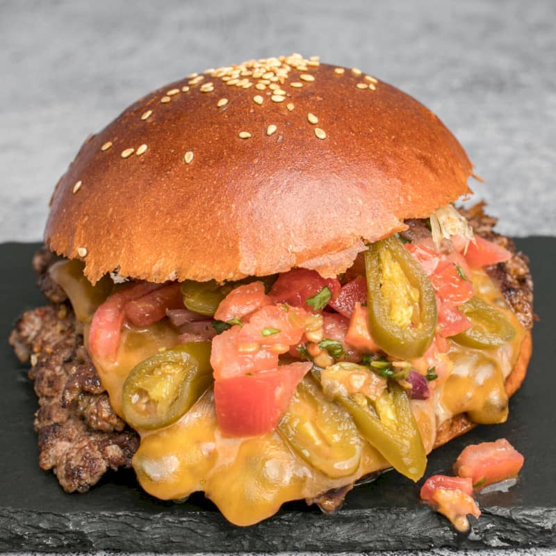 Acompañadas de patatas fritas Ingredientes: 2 pisos de 80 gr de ternera bien smasheada, queso cheddar fundido, rodajas de chile jalapeño y pico de gallo |