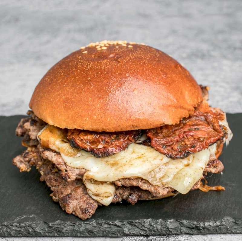 Acompañadas de patatas fritas Ingredientes: 2 pisos de 80 gr de ternera bien smasheada, queso manchego semicurado y tomate seco en aceite a la plancha |