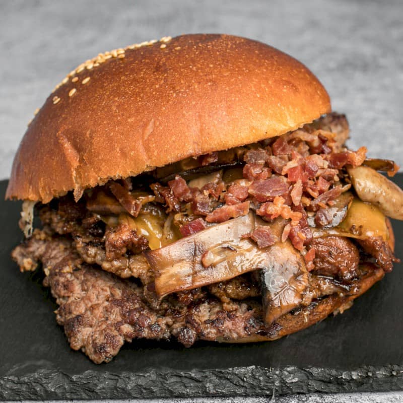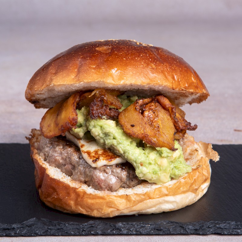 Acompañadas de patatas fritas Ingredientes: 2 pisos de 80 gr de ternera bien smasheada, queso cheddar fundido, virutas de jamón y champiñón salteado |
