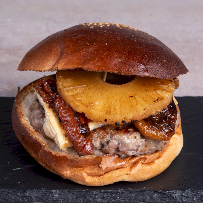 Acompañadas de patatas fritas Ingredientes: 200g de carne, piña caramelizada, tomate seco en aceite y queso brie. |