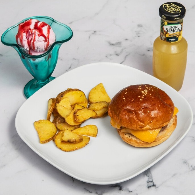 Hamburguesa de 100 grs. de ternera con queso cheddar, patatas fritas, yogur y bebida a elegir |