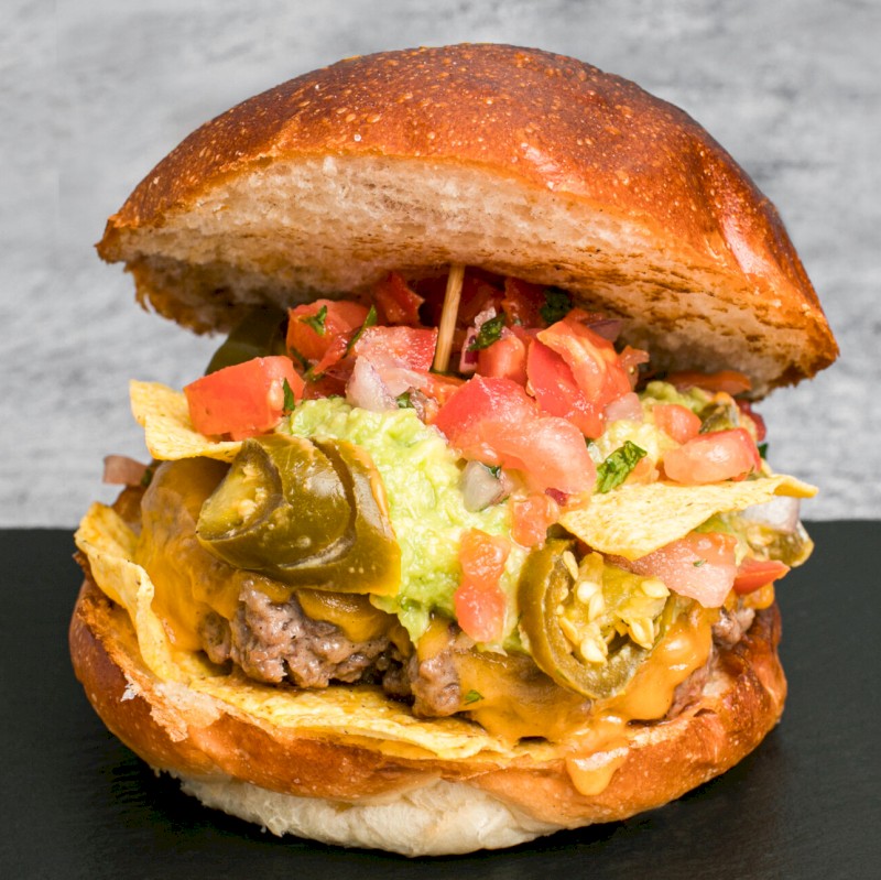 Acompañadas de patatas fritas Ingredientes: 200g de carne, queso cheddar, pasta de aguacate, pico de gallo, chiles jalapeños y nachos. |