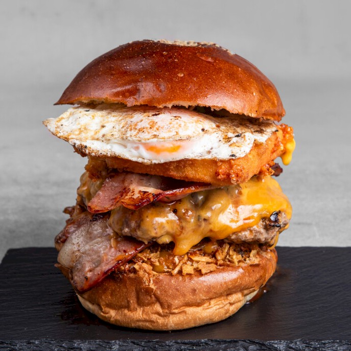 Acompañado de patatas fritas Ingredientes: 2 pisos de 200 grs. de carne, picadillo de matanza, cebolla crunchy, doble de bacon, cheddar empanado y huevo |