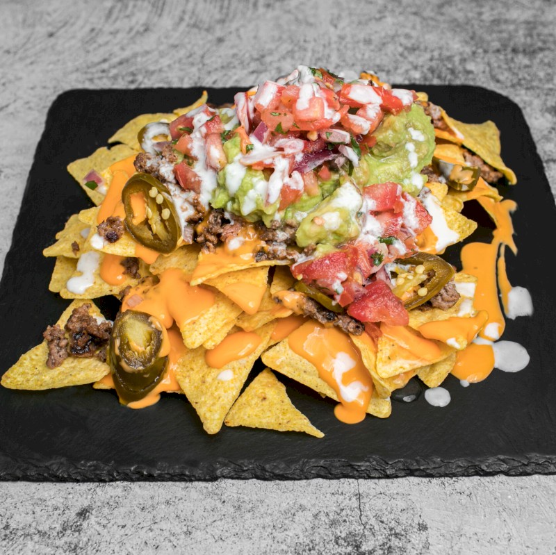 Ración de totopos cubiertos con cheddar fundido, carne de ternera, pico de gallo, guacamole, chiles jalapeños y crema agria. |