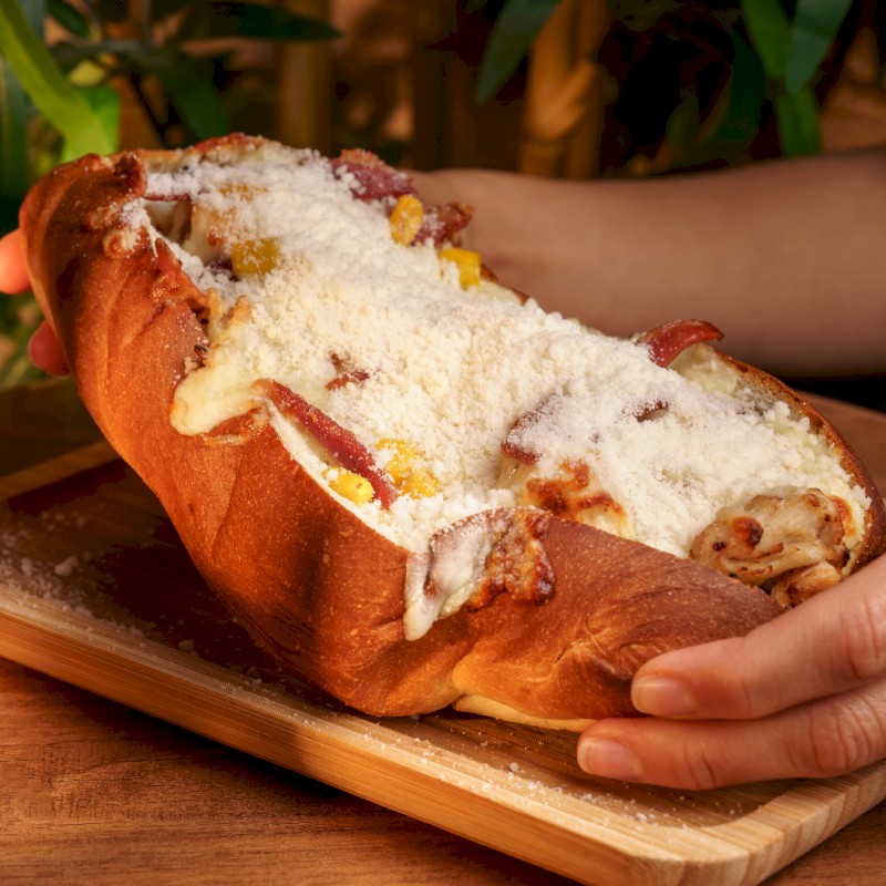 Ingredientes: 150 gr. de ternera, pollo o mixto, maíz, champiñón, cebolla crunchy, tiras de bacon, baño de mozzarella gratinada y parmesano espolvoreado |