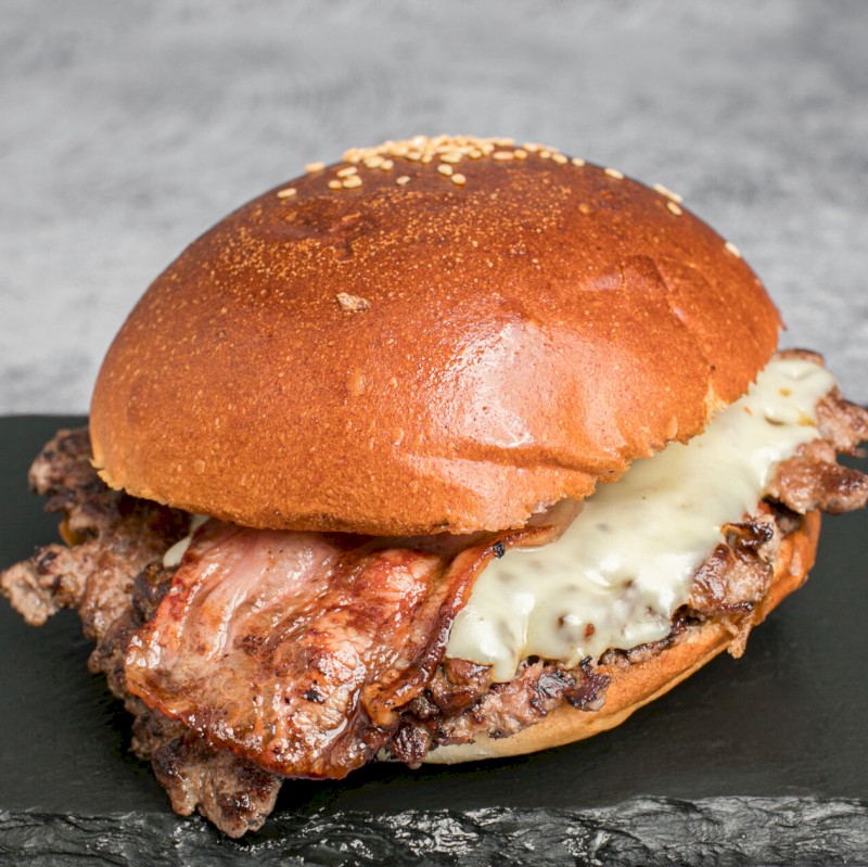 Acompañadas de patatas fritas Ingredientes: 2 pisos de 80 gr de ternera bien smasheada, queso gouda fundido y bacon ahumado a la plancha |