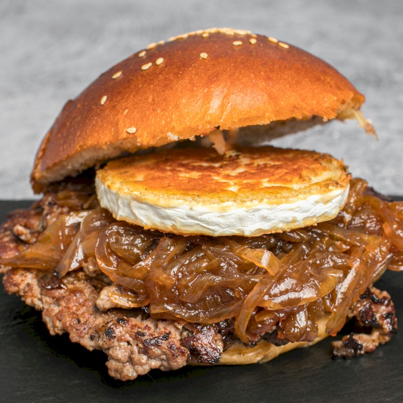 Acompañadas de patatas fritas Ingredientes: 2 pisos de 80 gr de ternera bien smasheada, rulo de queso de cabra a la plancha y cebolla caramelizada |