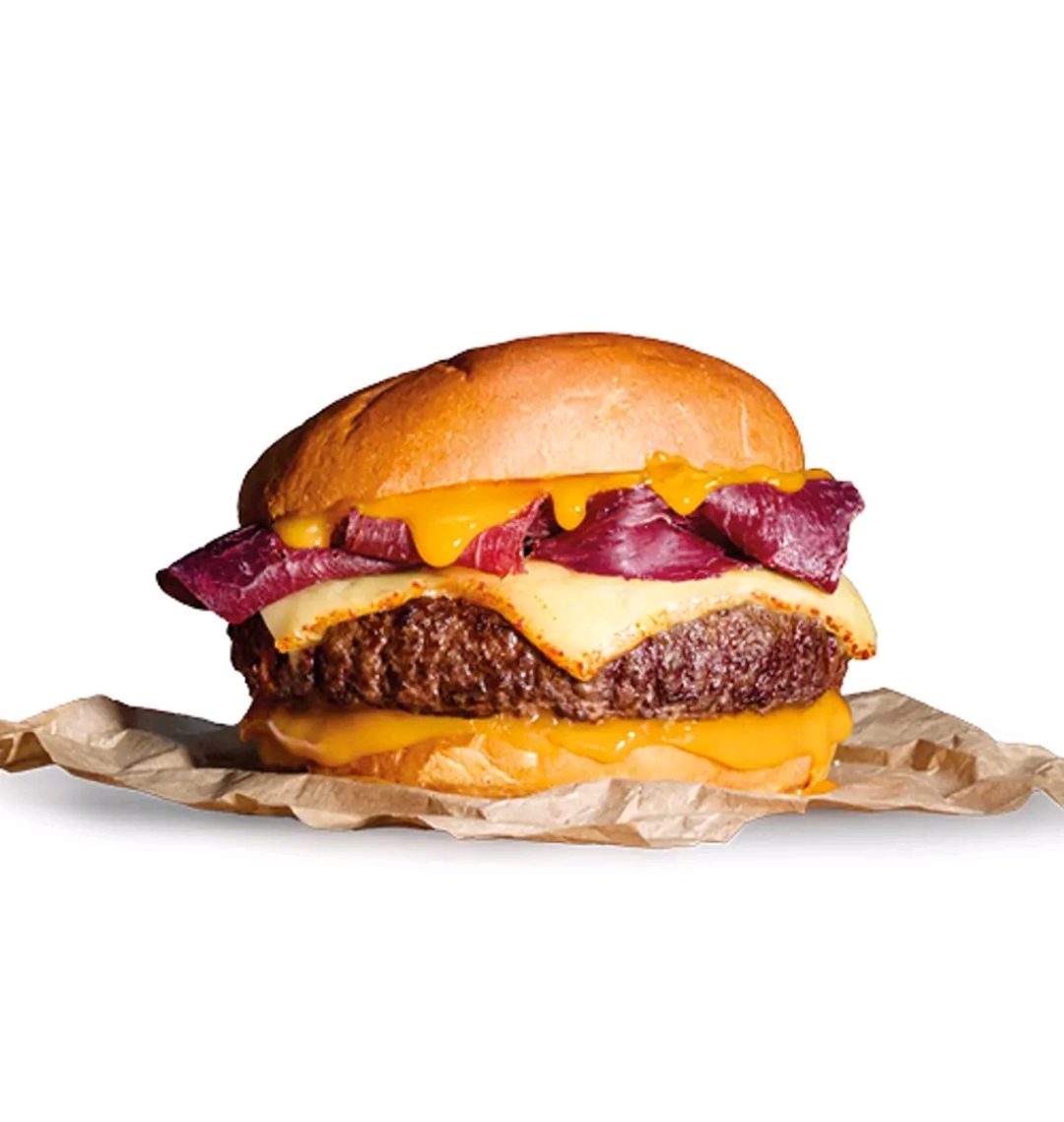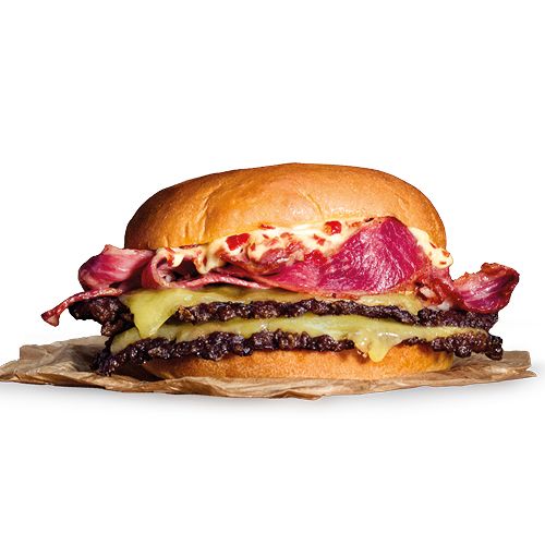 Ingredientes: Doble carne de lomo de vacuno* al estilo smash, crujiente de paleta ibérica, bacon de Angus, queso cheddar y mayonesa de huevo frito en pan estilo brioche. *60% de lomo de vacuno. |