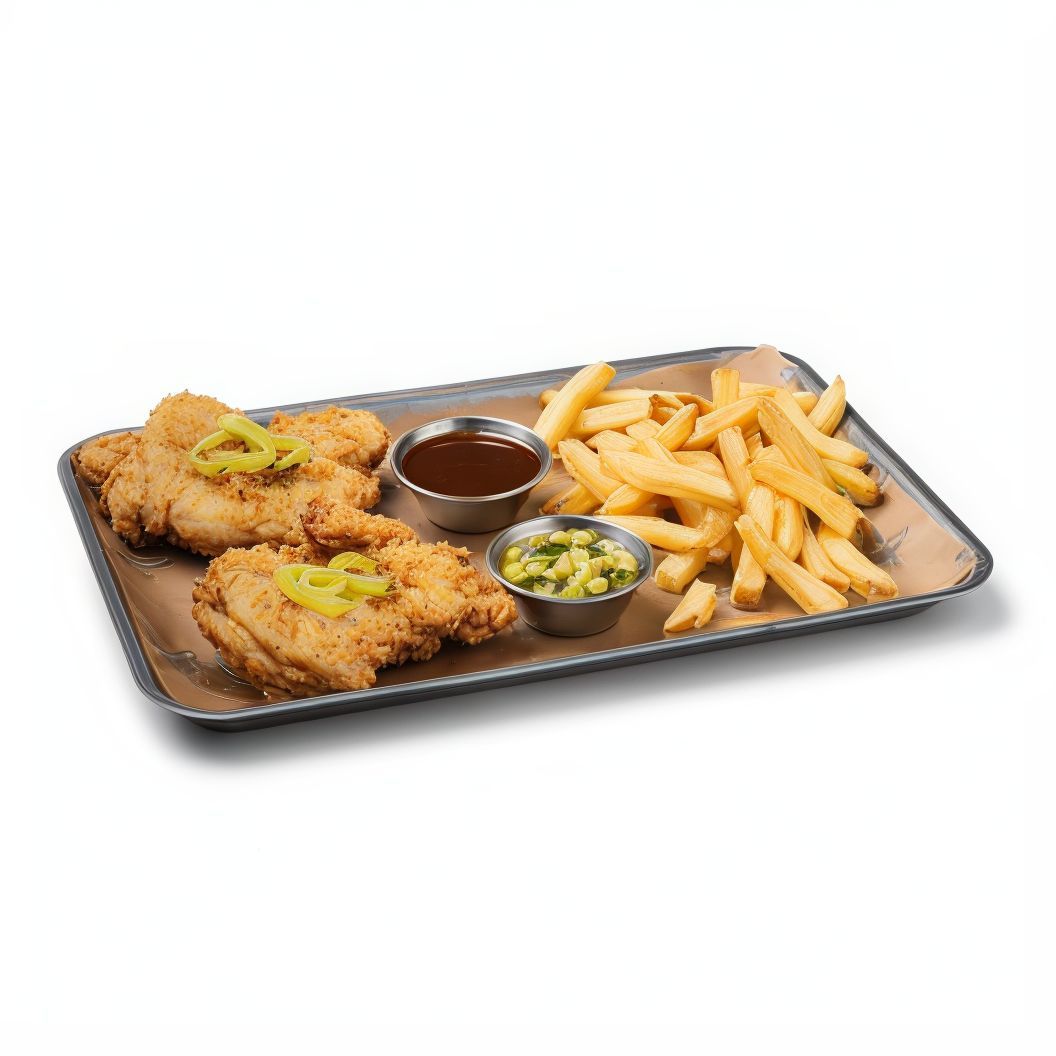 Tiras de pollo crujientes, acompañadas de mac&cheese, con salsa y guarnición a elegir. |