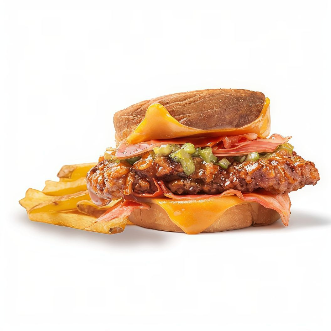 Pechuga de pollo crujiente, bacon ahumado, queso cheddar y Monterrey Jack con salsa mayo-pink y pepinillos en pan estilo brioche. |