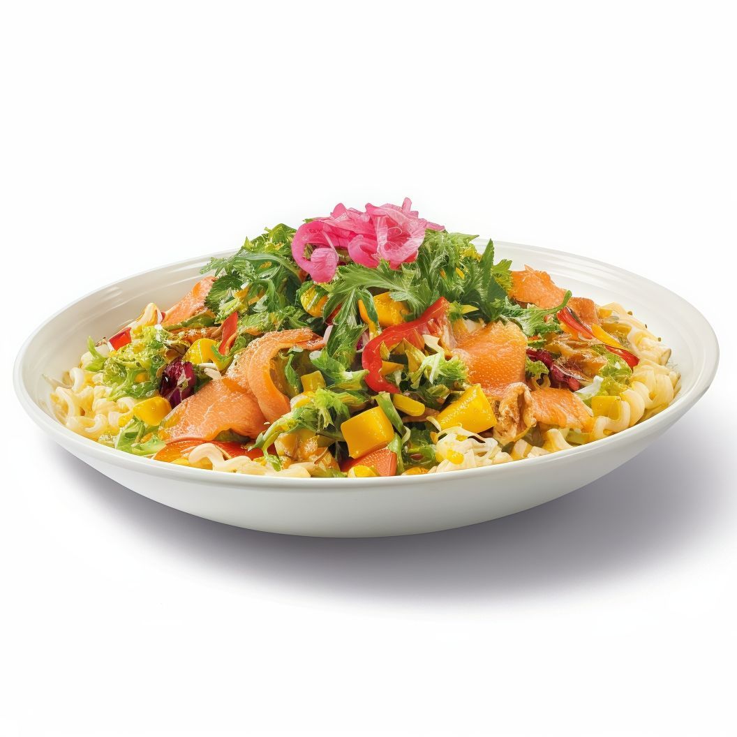 Ingredientes: Mezcla de lechugas, fusilli lunghi, salmón ahumado, mango, nueces, maíz, pimiento rojo, rúcula y cebolla encurtida con aliño cítrico y mostaza. Los productos de la pesca crudos han sido previamente congelados a Tª < de -20ºC, mínimo 24 horas. |