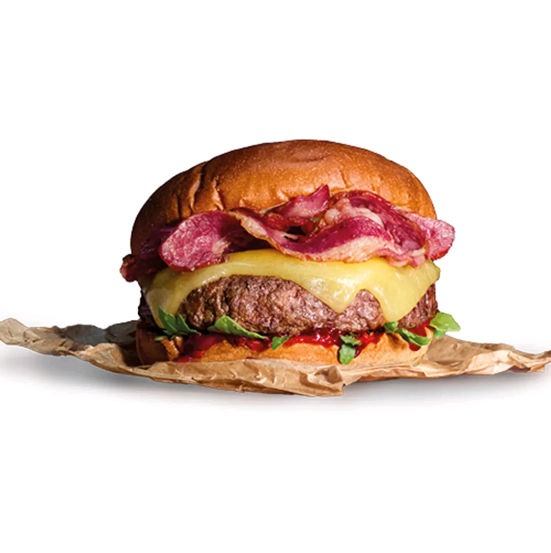 Ingredientes: Carne de vacuno, queso Monterrey Jack, bacon ahumado, con salsa bacon jam y salsa mayo smoked bacon en pan estilo brioche. |